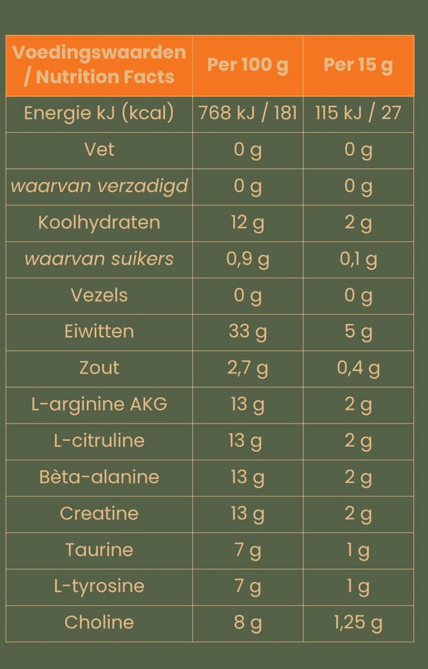 Wij voegen creatine toe aan onze pre-workout om dit effect nog te versterken. Creatine verbetert de energieproductie in de spieren dat op zijn beurt zorgt voor een verhoogde spierkracht en een sneller herstel.